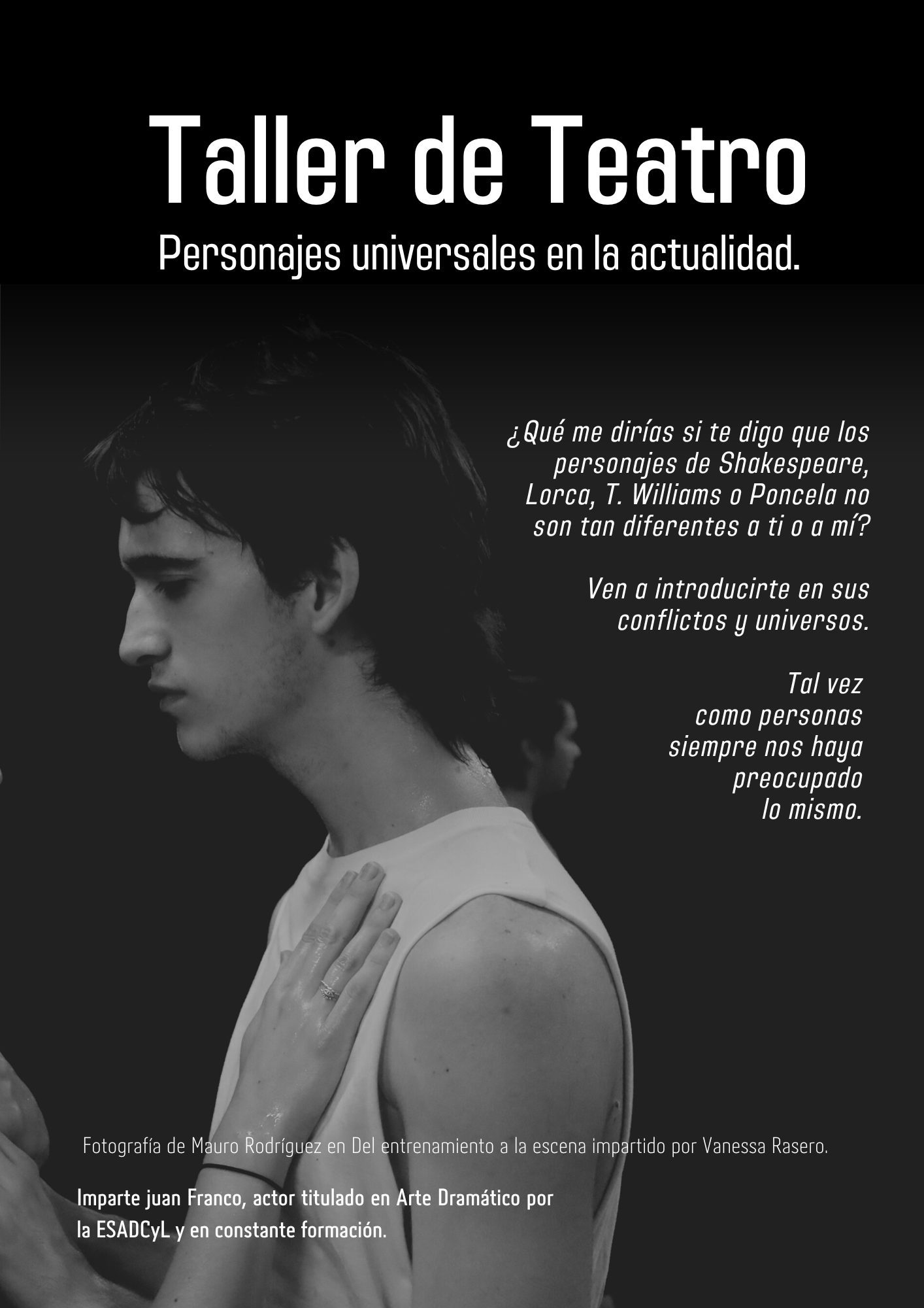 La primera vez que di una clase de teatro fue en el verano que terminé primero de interpretación. Daba unas clases en la cochera de mi casa clandestinamente a niños y adolescentes a 10€ el mes. Descubrí lo bonito que era acompañar a las personas en el encuentro con su propio cuerpo y las posibilidades que este ofrecía. La de herramientas en conexión con el instinto, los impulsos, las acciones, la voz, etc., que se podían desempolvar.